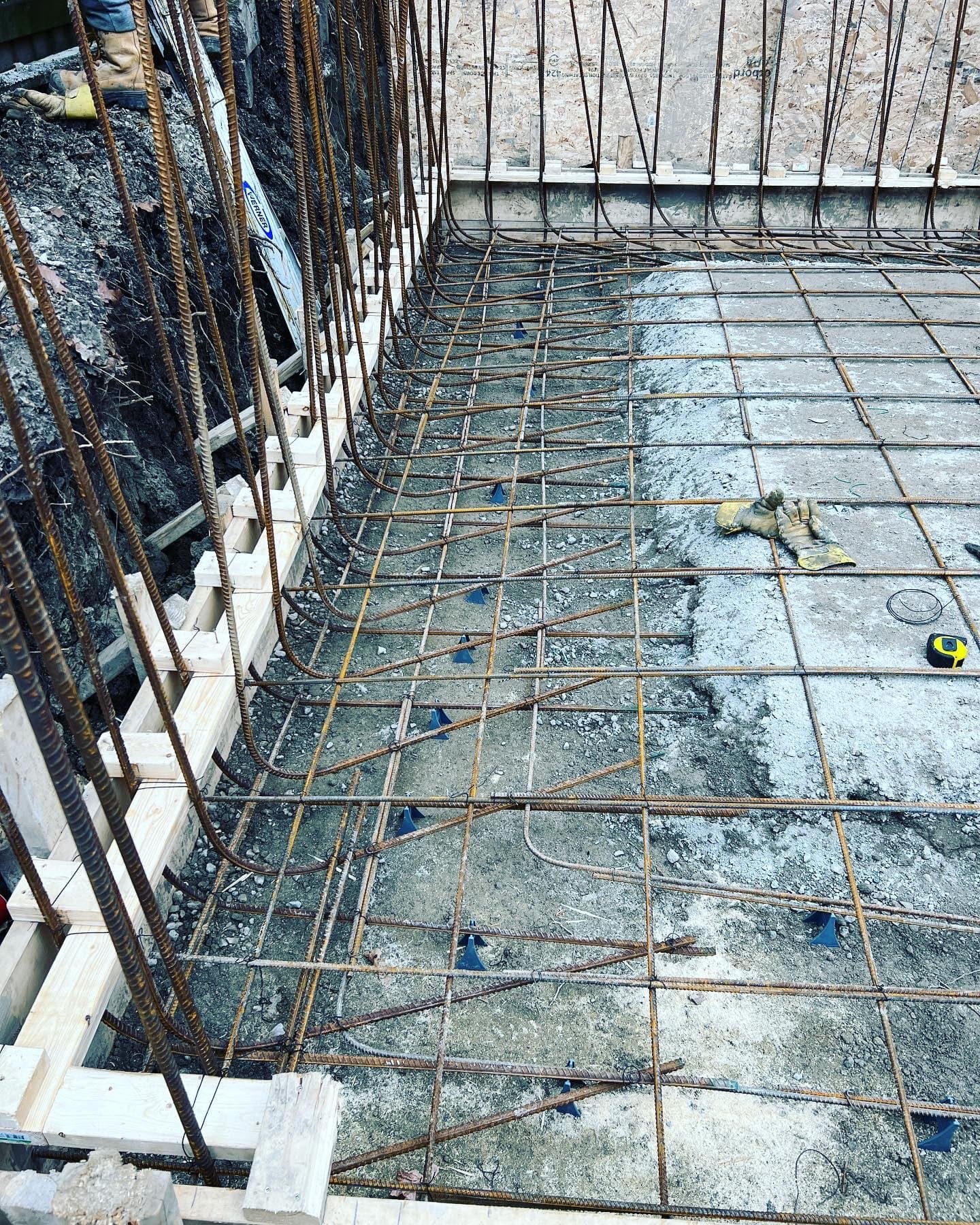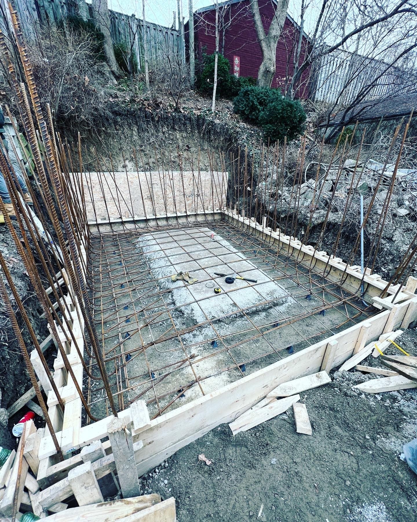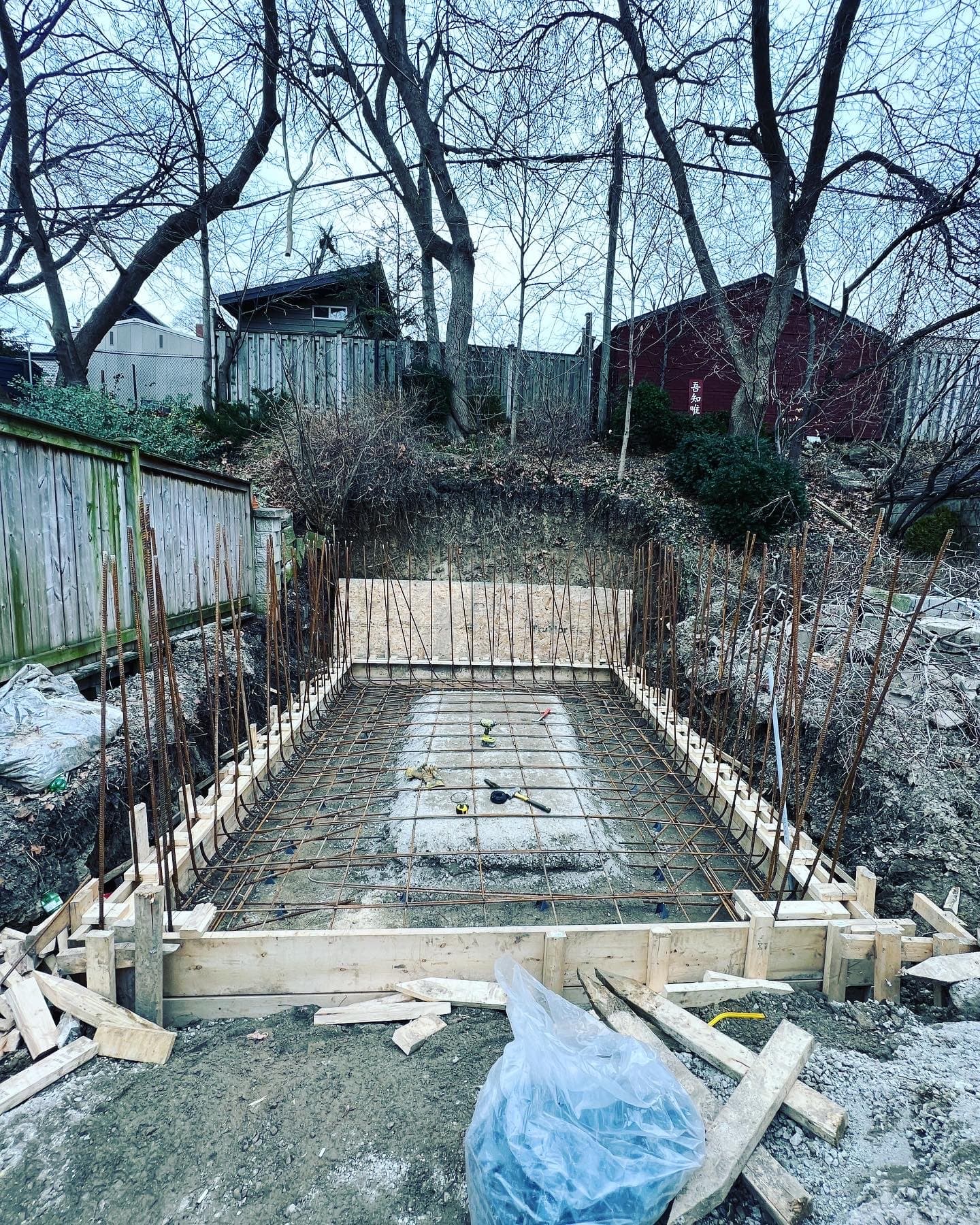A relatively small, yet intricate build. The steep rear elevation added complexity, requiring heavy structural input/design and particular care with the execution on site. Steel reinforced stepped concrete foundation walls/footings along with a structural slab 12in thick provided a solid base to house the client's classic car. The architect opted for an off-angle wall & roof design to create visual interest. This combined with the 'Pacific Turquoise' standing seam metal w/ varied widths and staggered joints delivered the unique overall aesthetic that was envisioned. Note the custom fabricated and colour matched eaves & downspouts, nothing standard on this build!