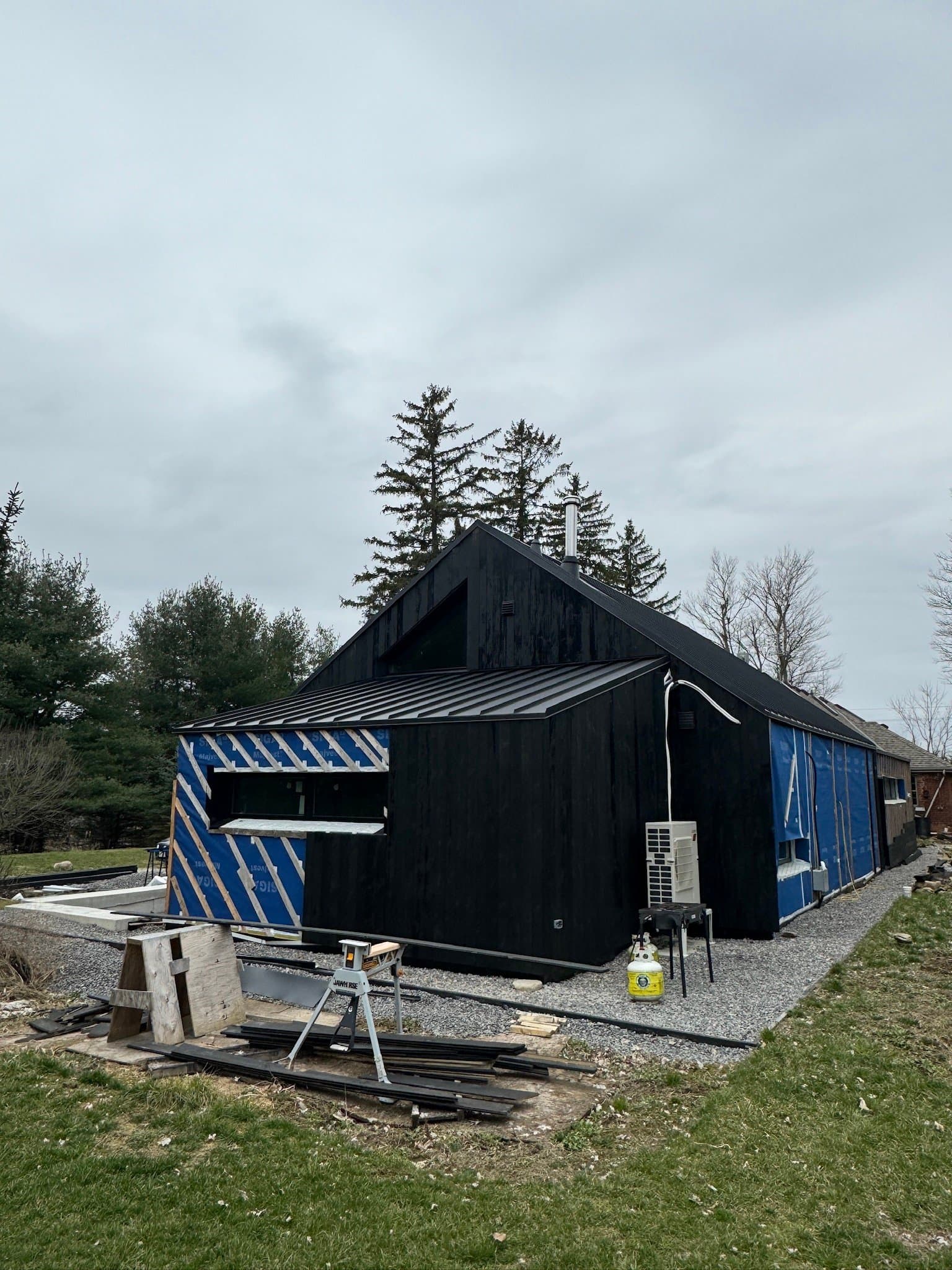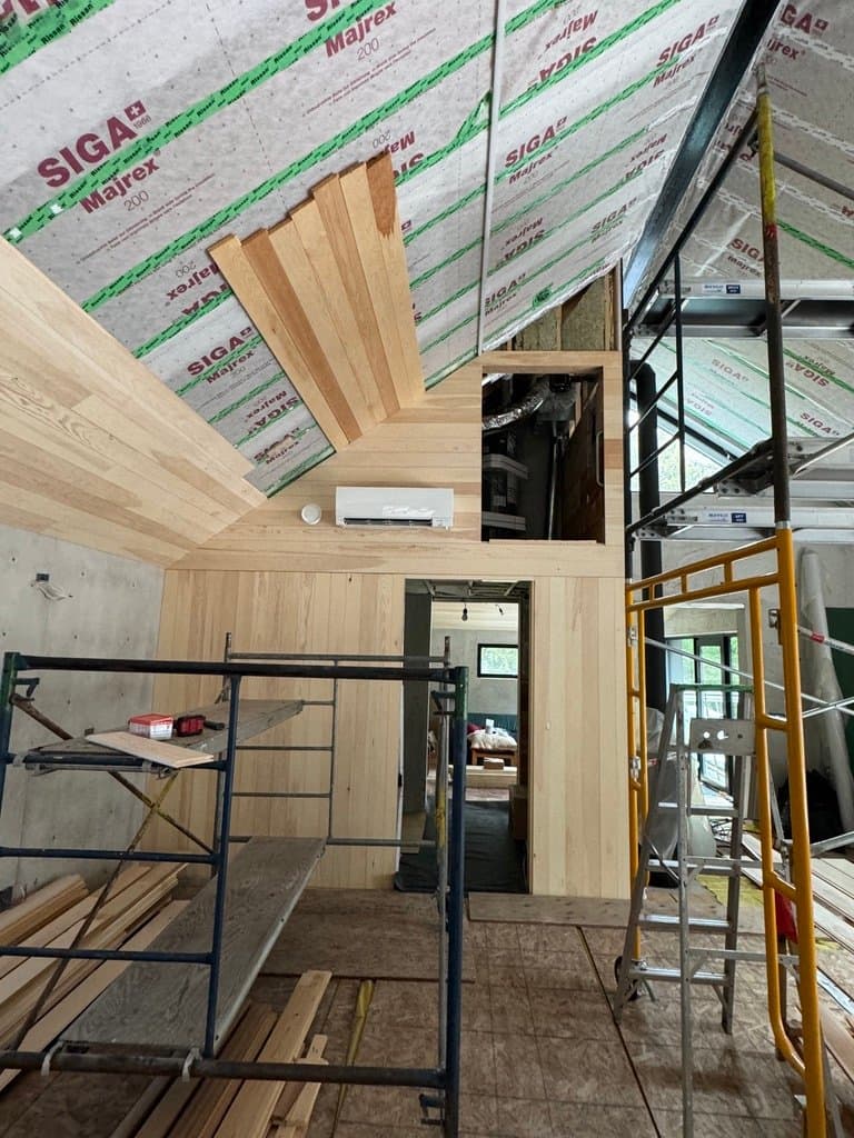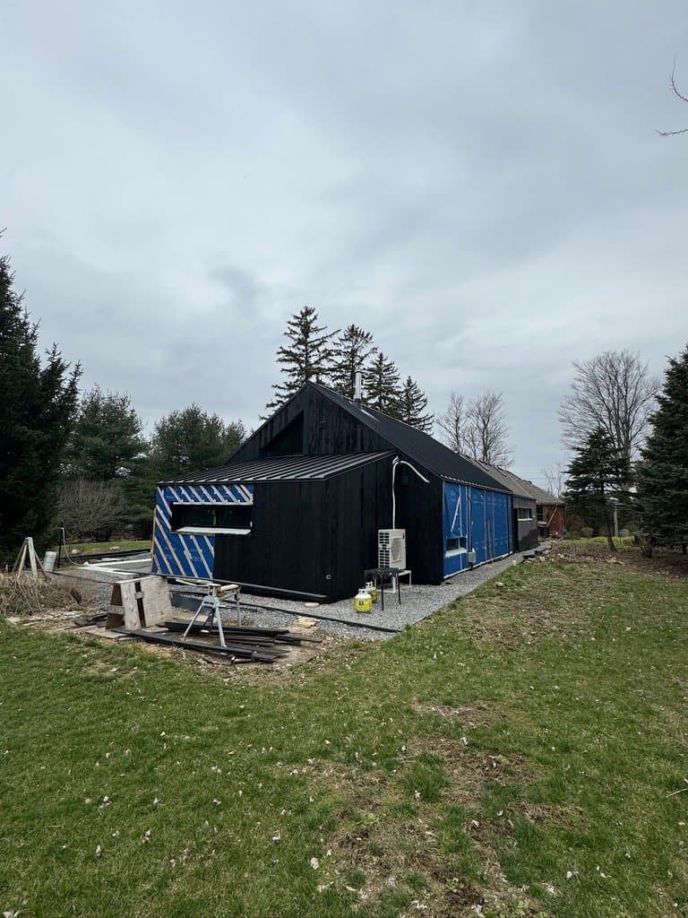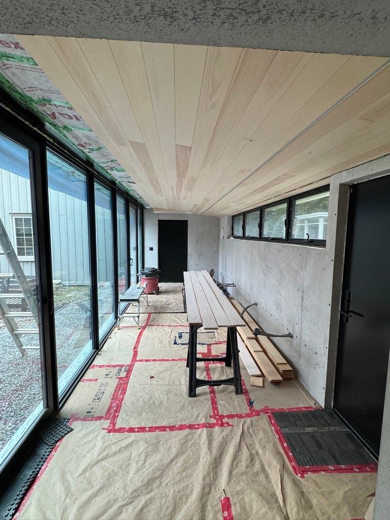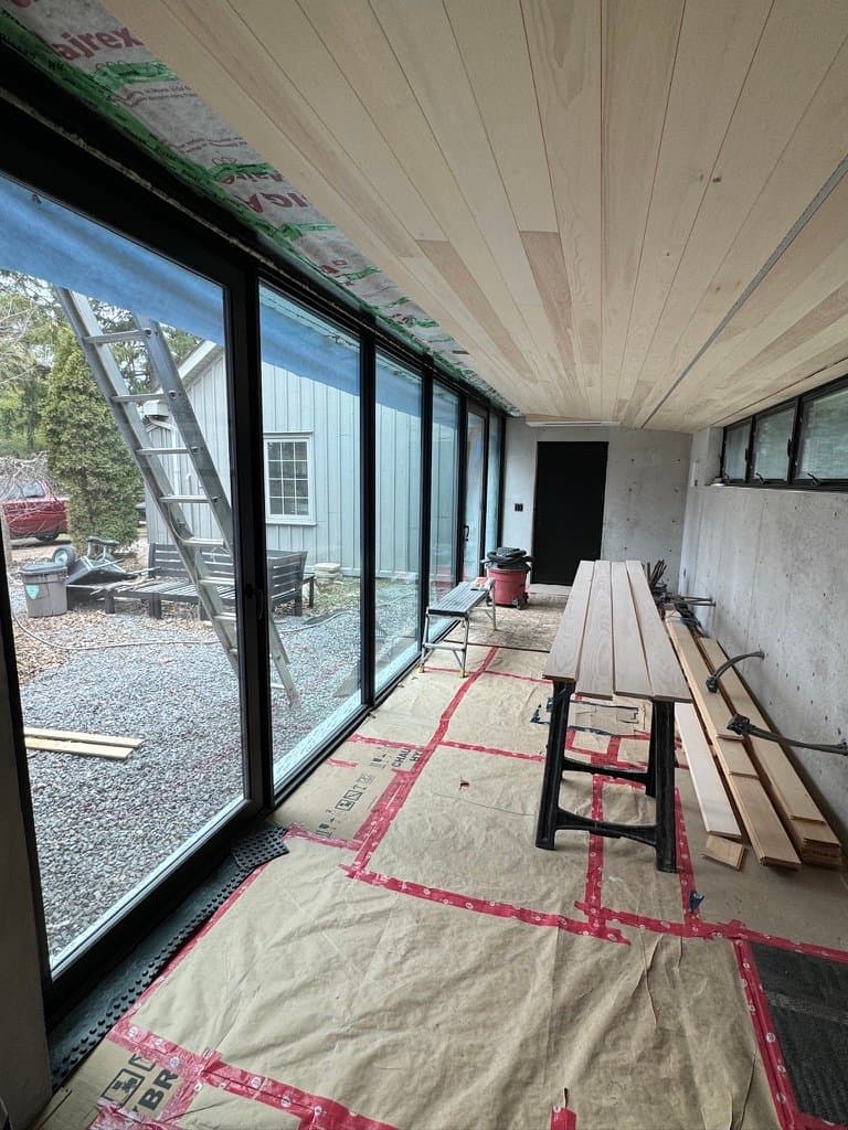 The owner of this Century old Farmhouse is a conservationist and thus was interested in building using Passive House techniques for this large addition. Specialty Energy & Building Science Consultants, Architects, and Engineers all collaborated to integrate the energy conserving components with a unique, modern design. Hyper insulated structural slab w/ full height formed in place concrete walls provide a beautiful interior finish and act as a thermal regulator for the building. Strategically located triple glazed windows not only look great, but are placed in mind of solar trajectory at different times of the year. Heat pump, ERV and separate HWT comprise the buildings mechanical systems w/ the addition of a Scandinavian wood burning fireplace. Huge glazed on-site fibreglass window walls make up the corridor connection to the existing dwelling. Custom milled clear pine has been applied as a ceiling covering, which dramatically warms the space in contrast to the architectural concrete surfaces. Cedar details in the washroom along with microcement wall covering and European fixtures carry through the natural & minimalist theme. W Construction is big fan of Big Ass Fans (look them up!) and so is this client, evident in the selection for the 17ft Great Room ceiling.