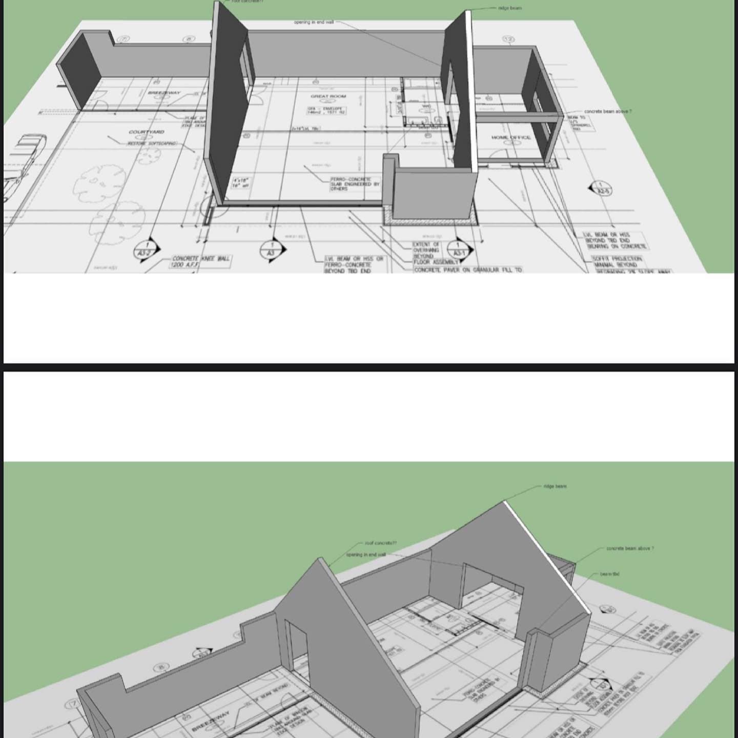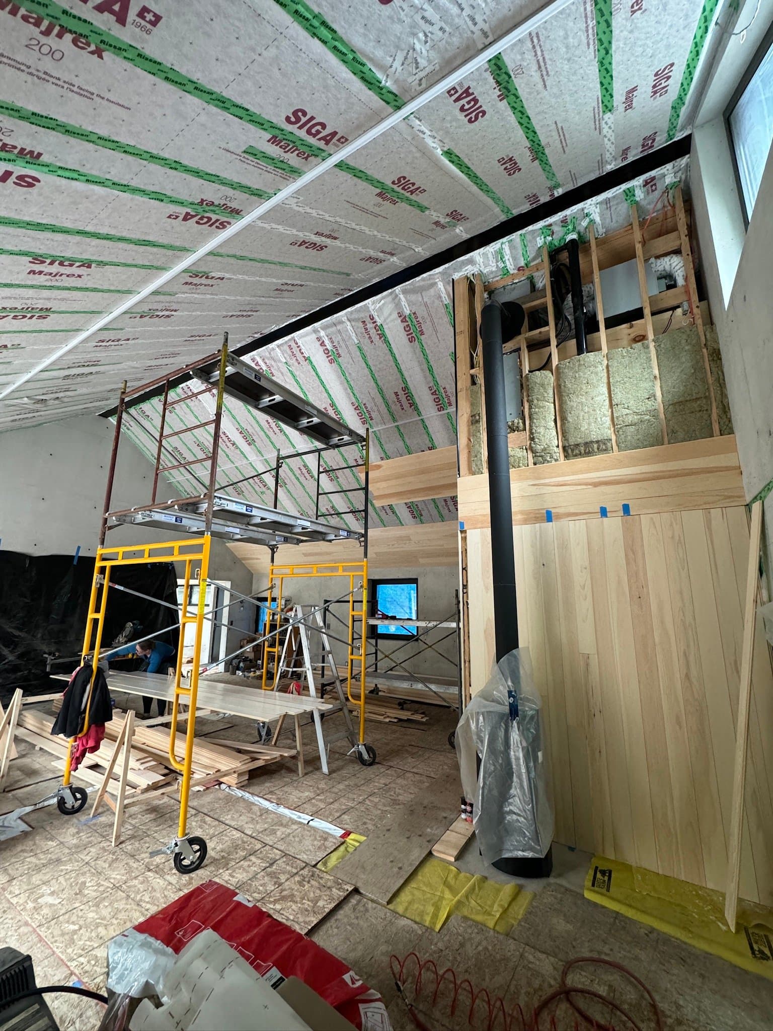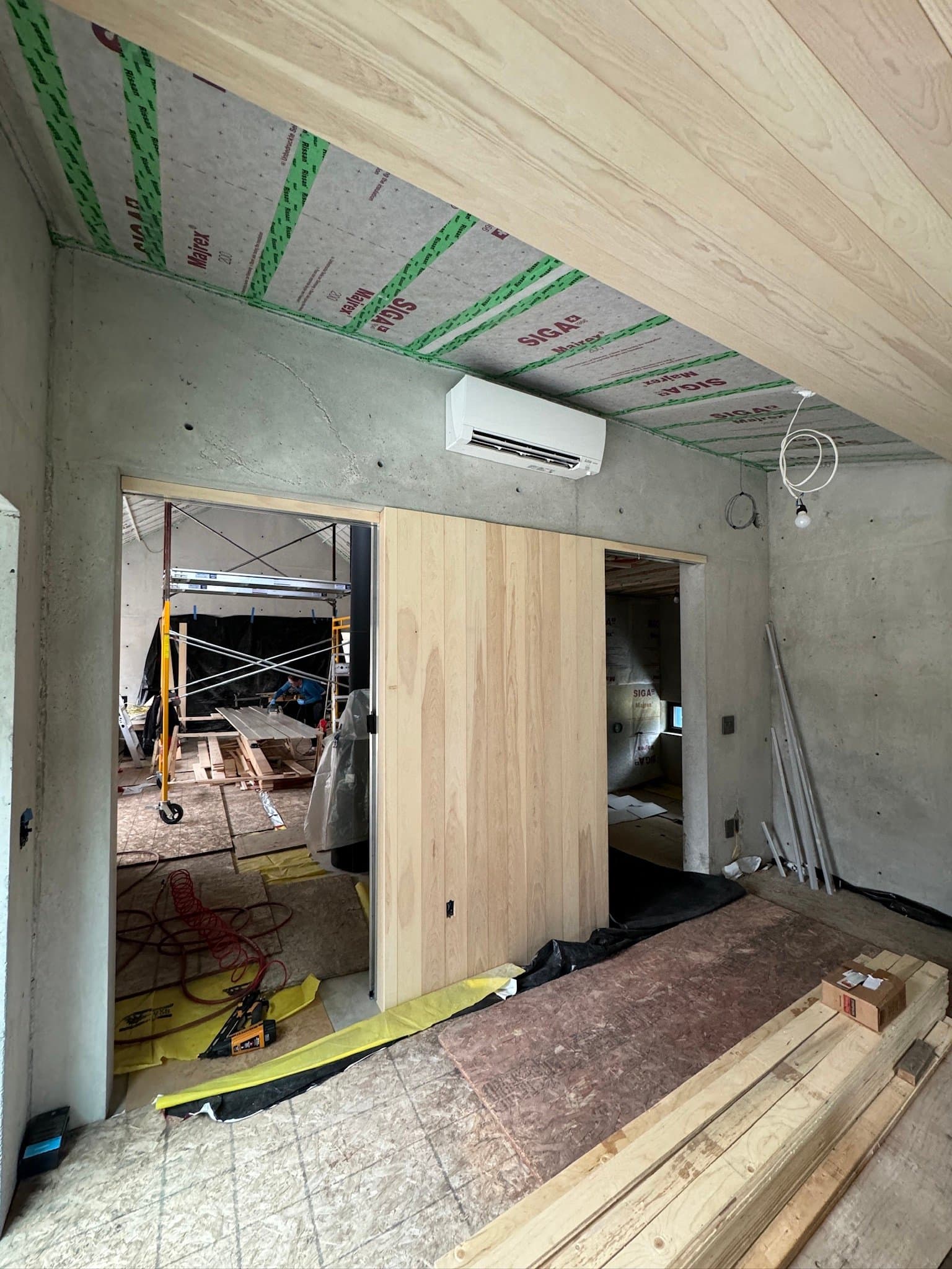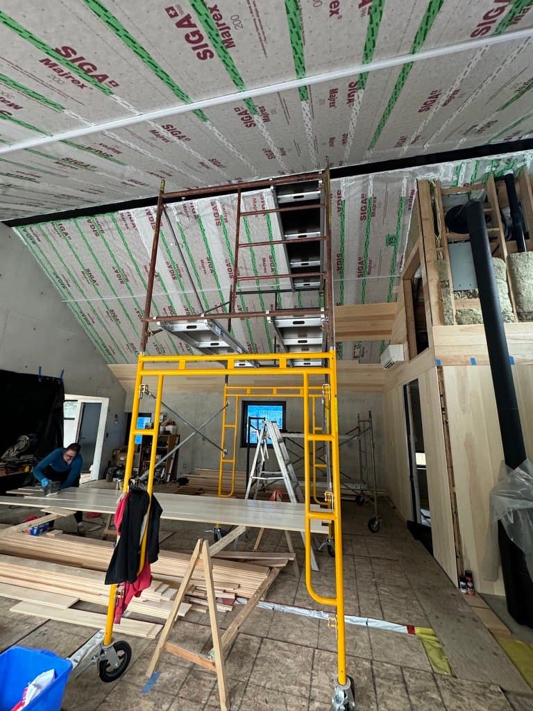 The owner of this Century old Farmhouse is a conservationist and thus was interested in building using Passive House techniques for this large addition. Specialty Energy & Building Science Consultants, Architects, and Engineers all collaborated to integrate the energy conserving components with a unique, modern design. Hyper insulated structural slab w/ full height formed in place concrete walls provide a beautiful interior finish and act as a thermal regulator for the building. Strategically located triple glazed windows not only look great, but are placed in mind of solar trajectory at different times of the year. Heat pump, ERV and separate HWT comprise the buildings mechanical systems w/ the addition of a Scandinavian wood burning fireplace. Huge glazed on-site fibreglass window walls make up the corridor connection to the existing dwelling. Custom milled clear pine has been applied as a ceiling covering, which dramatically warms the space in contrast to the architectural concrete surfaces. Cedar details in the washroom along with microcement wall covering and European fixtures carry through the natural & minimalist theme. W Construction is big fan of Big Ass Fans (look them up!) and so is this client, evident in the selection for the 17ft Great Room ceiling.